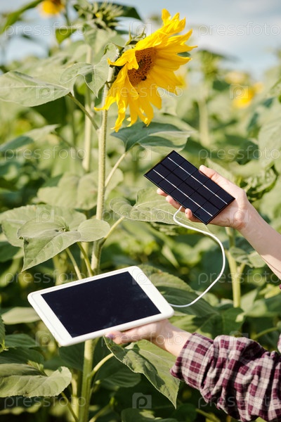 Руки молодой фермеры, держащей цифровой планшет, подключенный к солнечной батарее