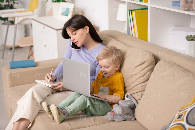 Счастливый милый мальчик играет с ноутбуком, сидя на диване занятой матерью