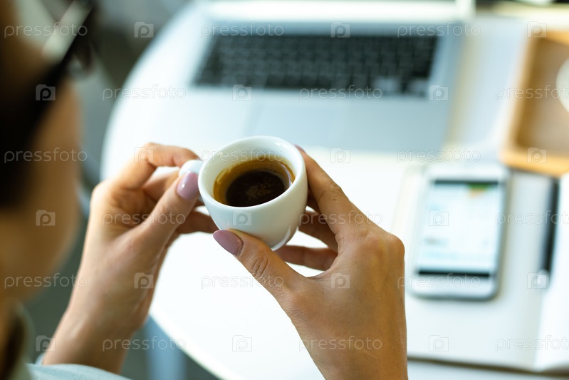 Руки молодой женщины, держащей небольшую фарфоровую чашку с сильным черным кофе