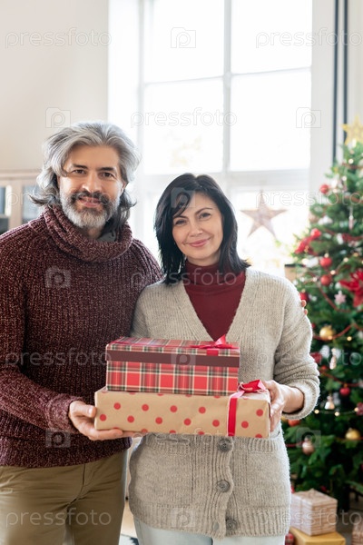 Веселая зрелая пара в повседневной одежде держит подарочные коробки с подарками для семьи