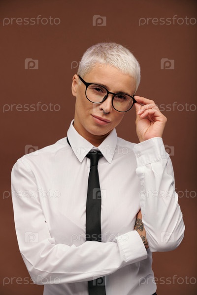 Молодая серьезная мужская женщина в формальной одежде, касающаяся ее очков