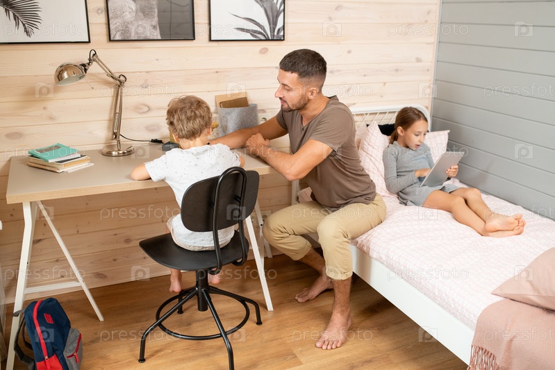 Молодой человек в повседневной одежде помогает своему милому маленькому сыну с домашними заданиями у стола