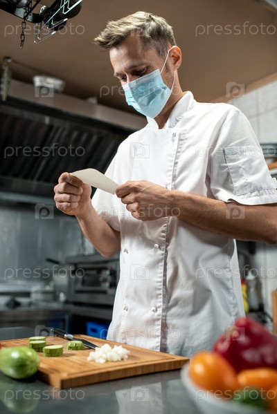 Молодой шеф-повар в защитной маске стоит за столом с нарезанным луком и кабачкой