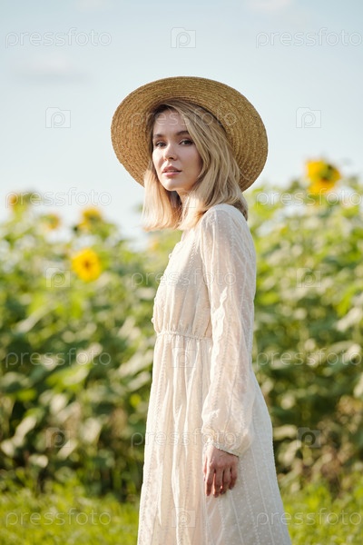 Красивая молодая блондинка в соломенной шляпе и белом платье стоит на улице