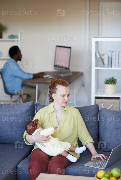 Молодая мать, использующая ноутбук дома