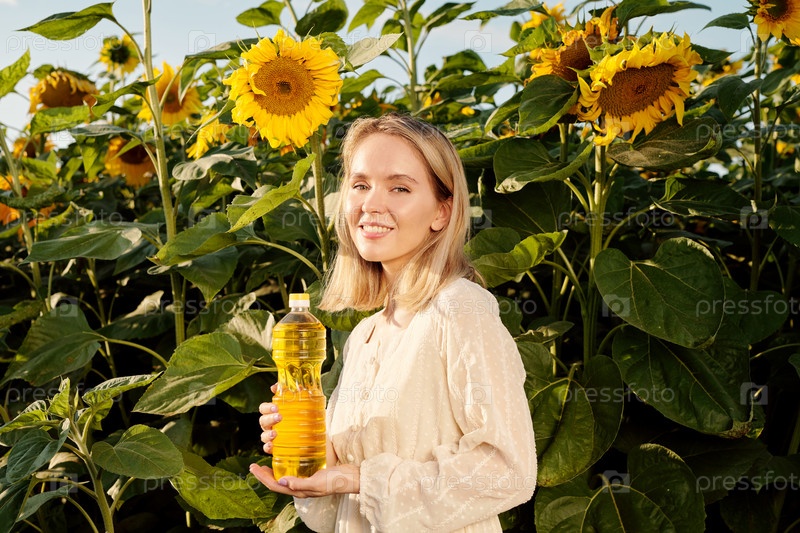 Красивая блондинка, молодая женщина держит бутылку подсолнечного масла в поле