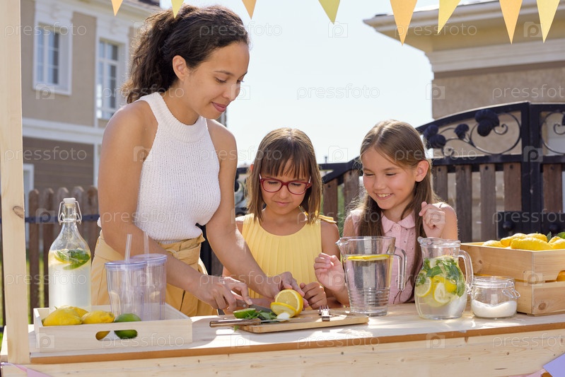 Красивая молодая самка нарезает свежие лимоны и лаймы на деревянной доске у киоска