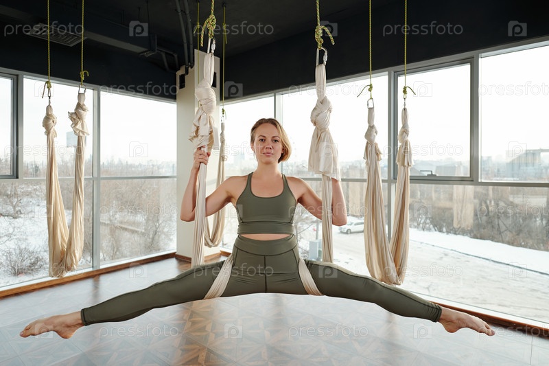 Активная женщина в сером спортивном костюме смотрит на тебя и держит ноги вытянутыми