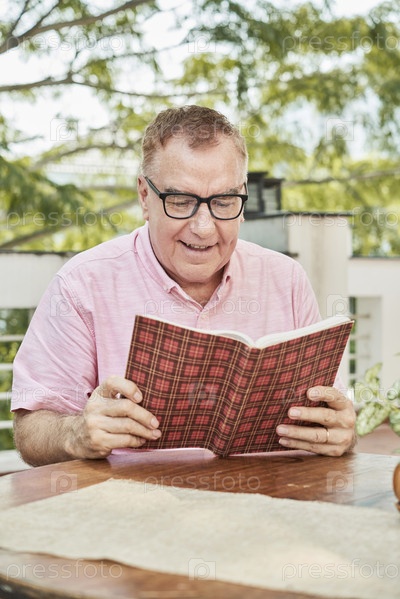 Старший мужчина читает увлекательную книгу