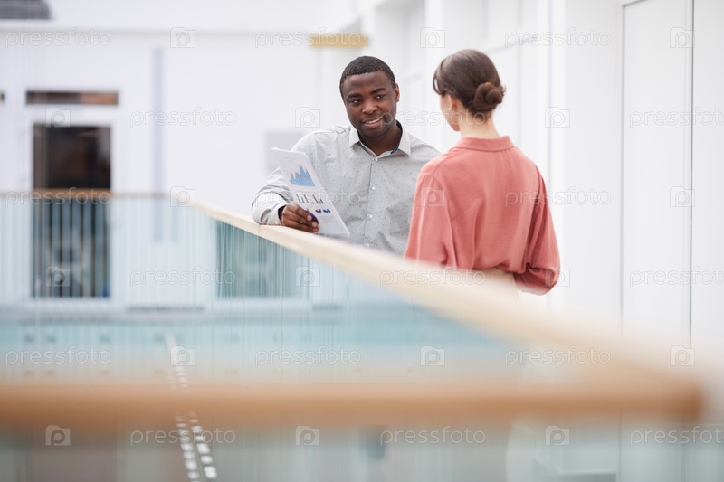 Улыбающийся африканский бизнесмен разговаривает с женщиной на балконе