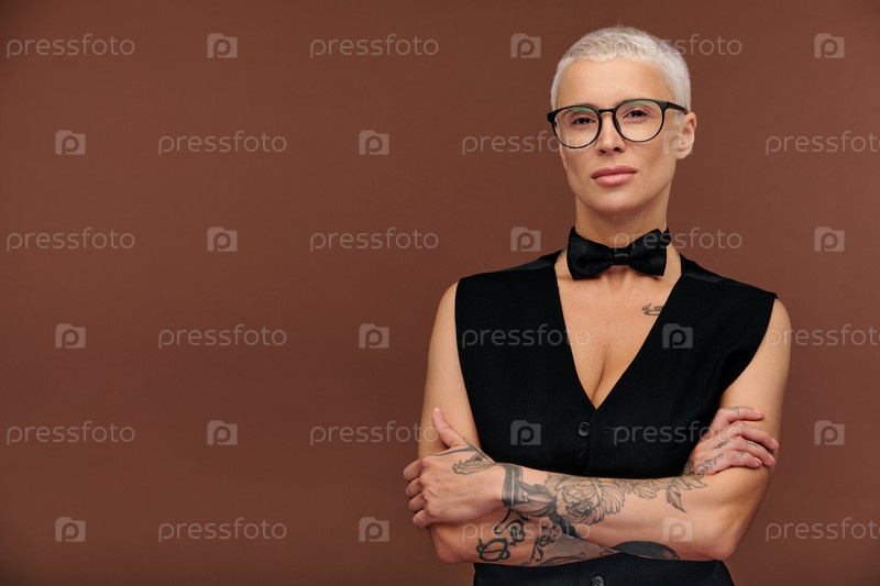 Мужской блондинка-женщина в черном жилете и галстуке, скрестив руки на груди