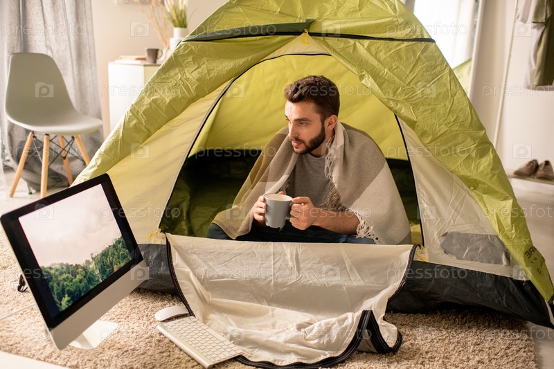 Человек изображает то, что он кемпирует в лесу