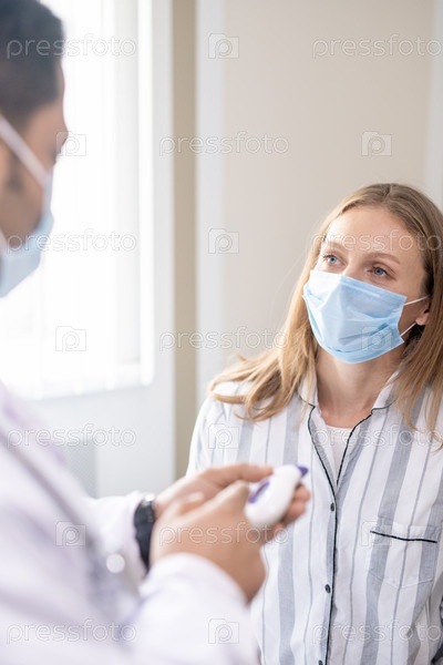 Молодая женщина-пациент в маске смотрит на своего врача во время медицинской консультации