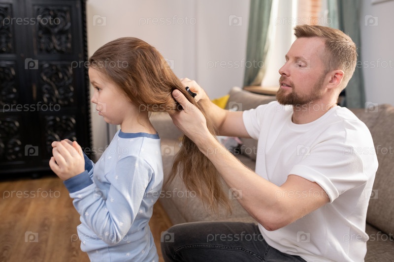 Молодой осторожный отец с щеткой чистит длинные волосы своей маленькой дочери