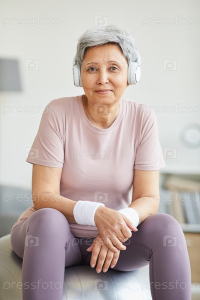 Пожилая женщина сидит на фитнес-боле