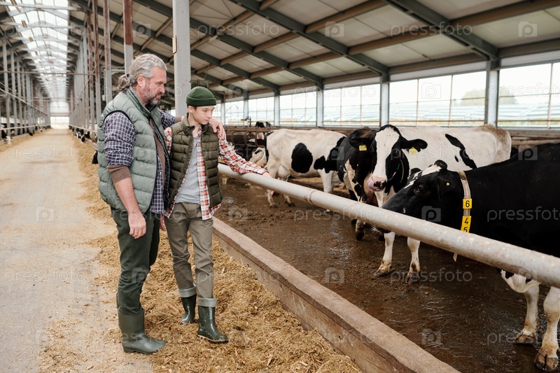 Отец рассказывает сыну о том, как ухаживать за коровой