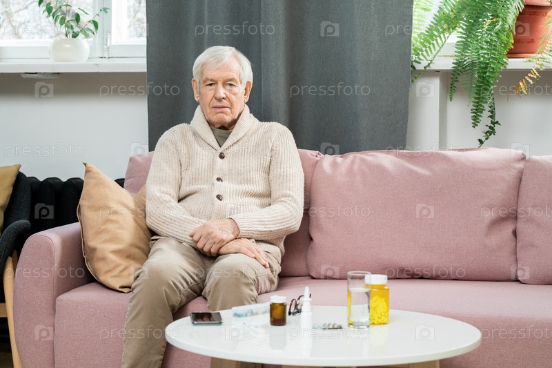 Пожилой мужчина в повседневной одежде сидит на диване у маленького столика и ждет врача
