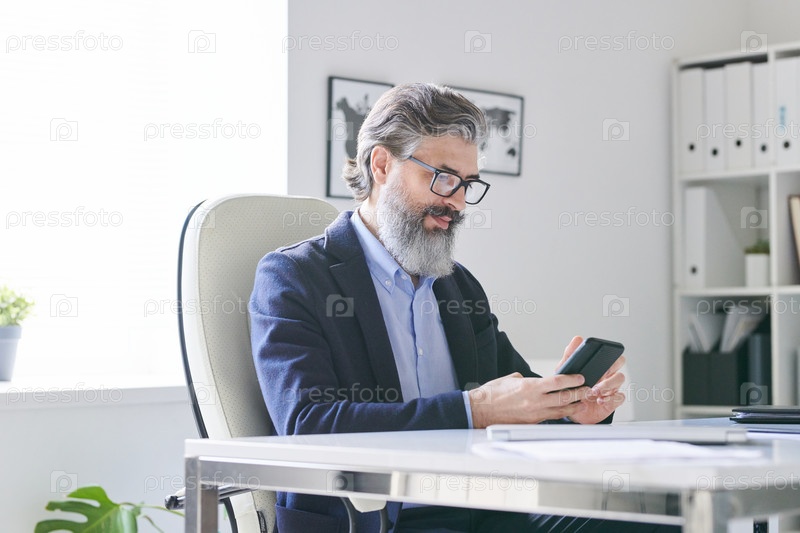Загруженный старший профессионал с седыми волосами и бородой прокручивает смартфон