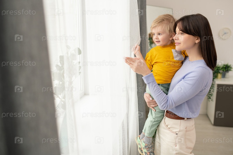 Молодая женщина держит своего милого маленького сына за руки, стоя у окна