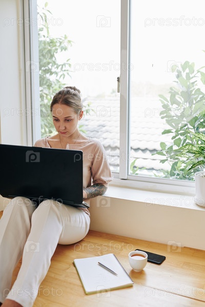 Женщина, работающая на ноутбуке дома
