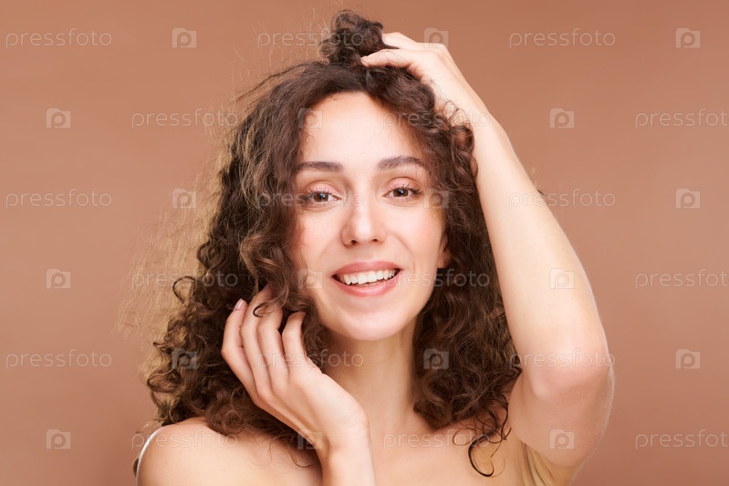 Счастливая молодая самка с зубчатой улыбкой, здоровой кожей и роскошными темно-волнистыми волосами