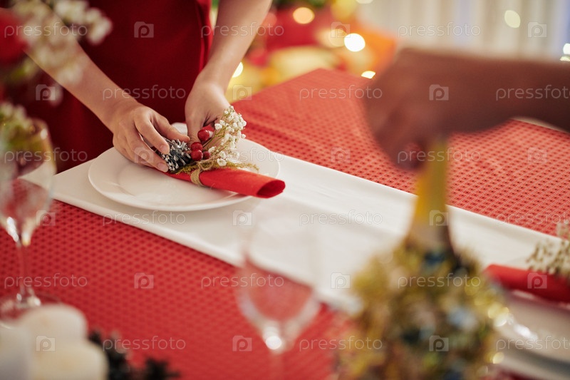 Домашняя хозяйка украшает стол на Рождество