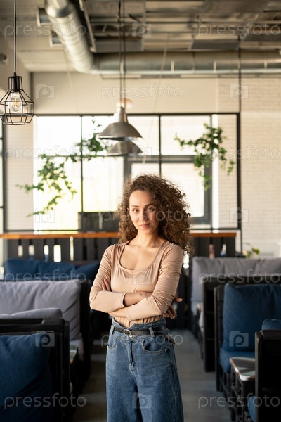 Кудрявый предприниматель в собственном уютном кафе