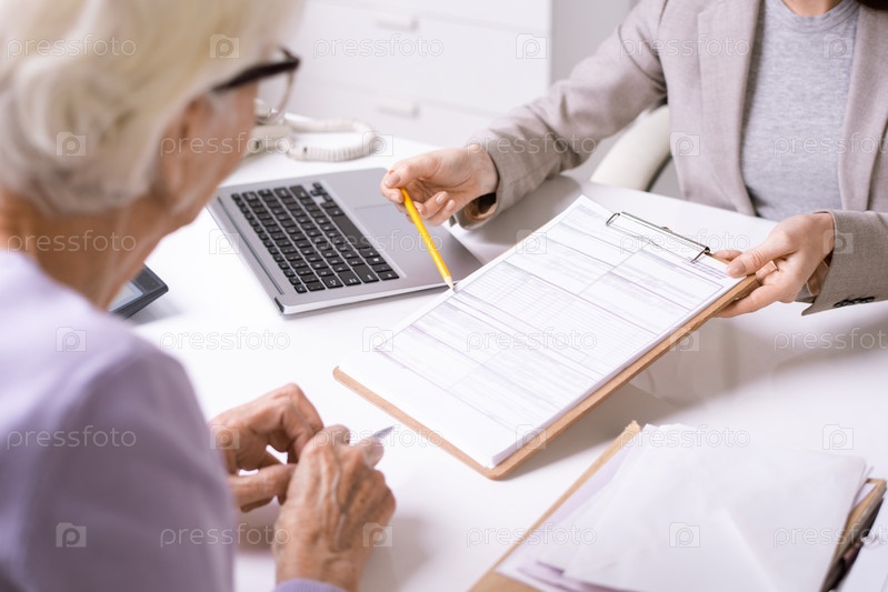 Рука молодого уверенного в себе страхового агента с карандашом, указывающим на форму