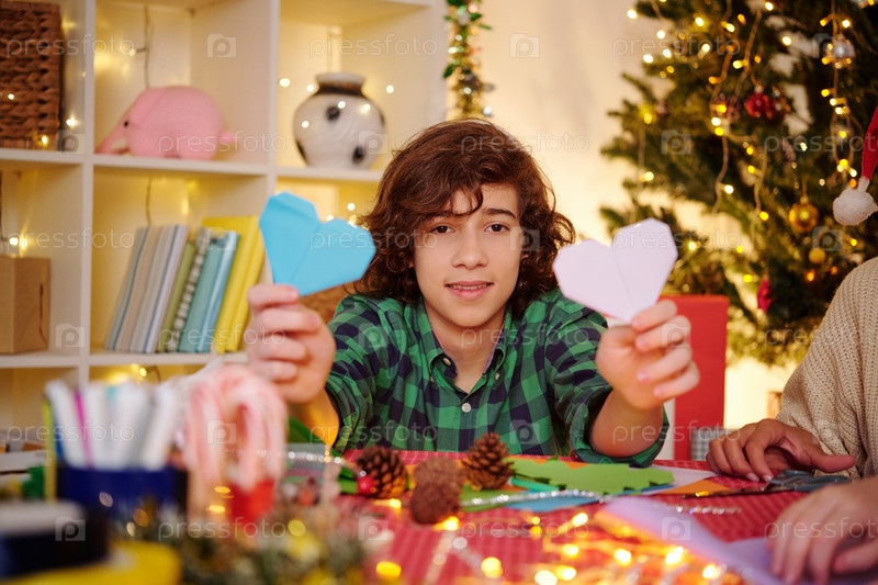 Мальчик показывает цветные бумажные сердца