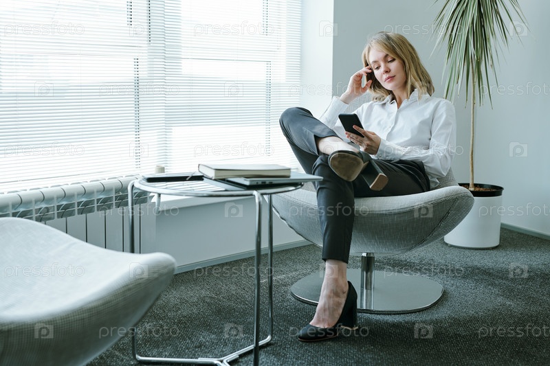 Молодая блондинка, расслабленная деловая женщина в формальной одежде, сидящая в кресле у окна