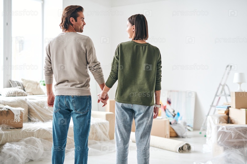 Задний вид молодого любящего мужа и жены в повседневной одежде, держащихся за руки