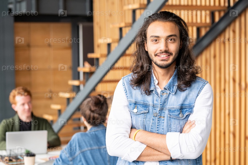 Успешный бизнесмен смешанной расы со скрещенными руками у груди смотрит на тебя