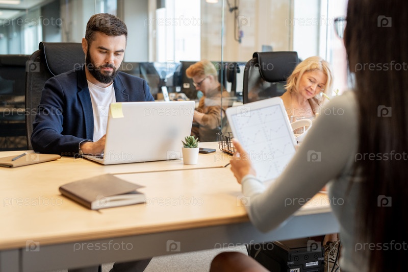 Молодой бородатый бизнесмен и зрелая блондинка работают по отдельности