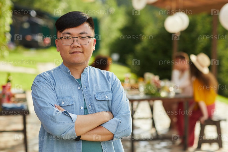 Молодой азиатский мужчина позирует на открытой летней вечеринке