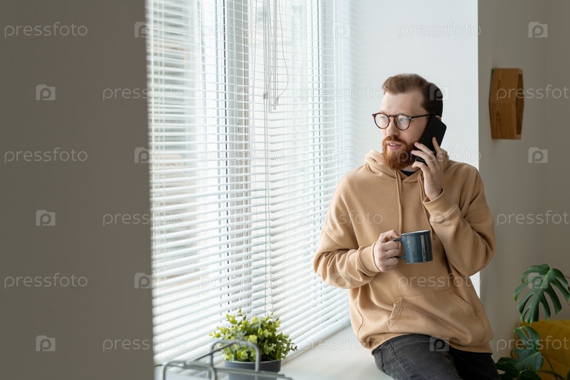 Молодой бородатый бизнесмен в повседневной одежде и очках разговаривает со смартфоном