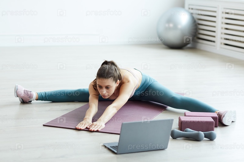 Молодая женщина растягивает ноги во время онлайн-тренировки