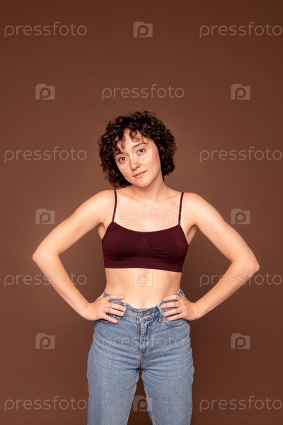 Молодая великолепная брюнетка с короткими кудрявыми волосами, держа руки на талии