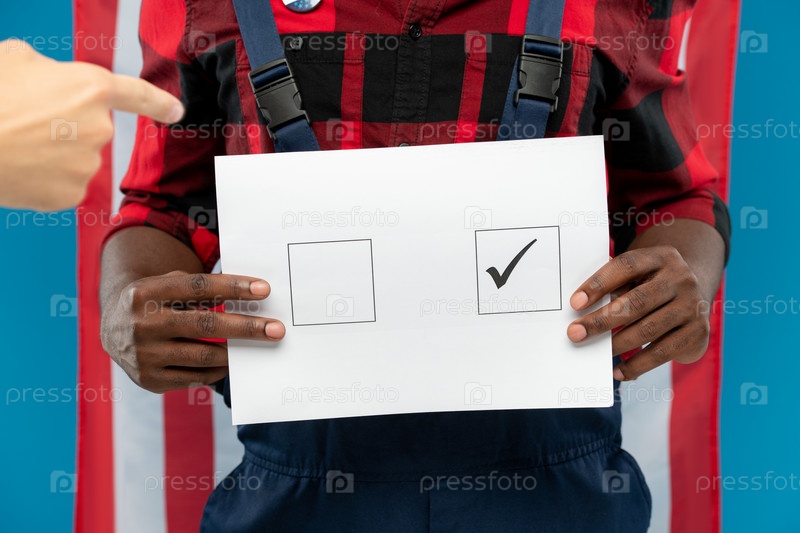 Молодой чернокожий механизатор держит бюллетень с клещом в квадрате на флаге США