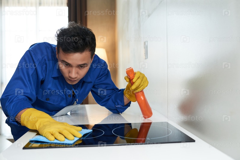 Работник очищает поверхность плиты