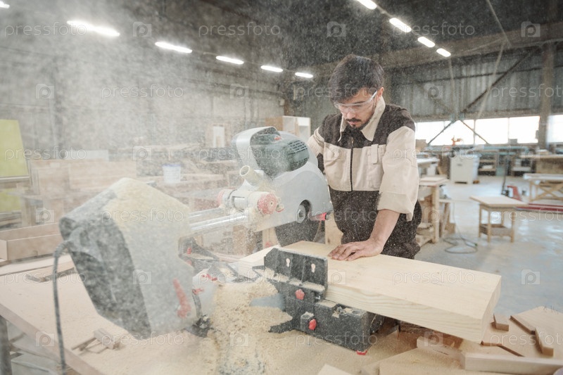 Молодой работник фабрики по производству мебели использует электропилу на работе