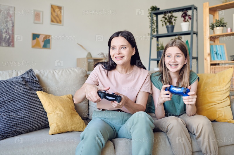 Молодая улыбающаяся мать и милая девочка-подросток с джойстиками играют в видеоигры