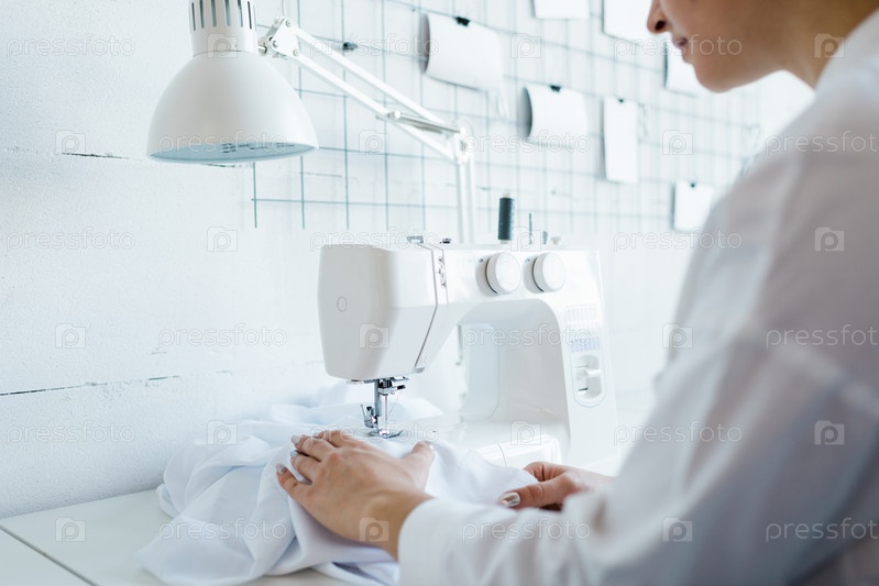 Молодая женщина-работница швейной фабрики в белом рабочем наряде сидит у электрической машины