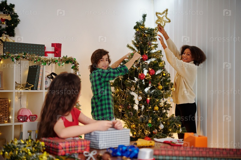 Дети украшают рождественскую елку