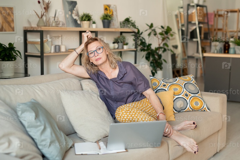 Зрелая блондинка расслабленная деловая женщина в повседневной одежде, сидящая на диване дома