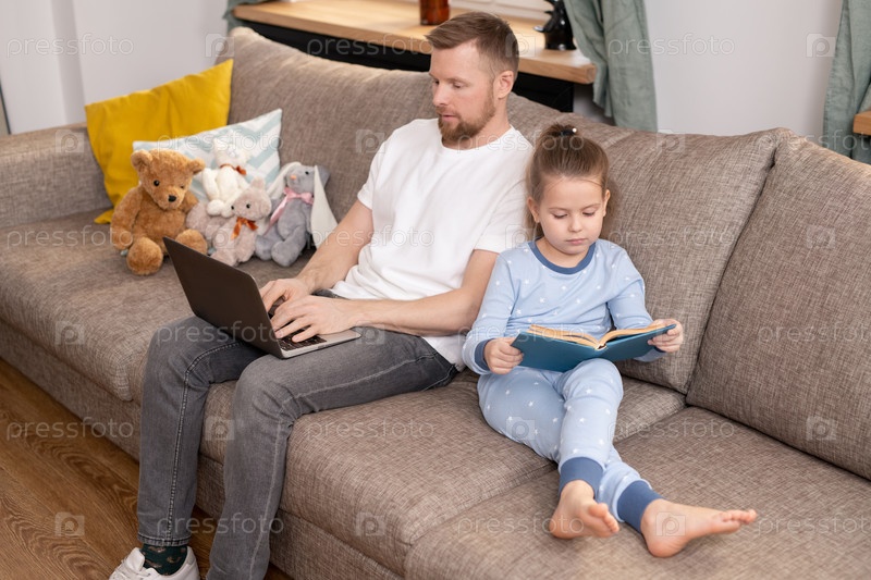 Милая маленькая девочка читает книгу, в то время как ее отец с ноутбуком сидит рядом