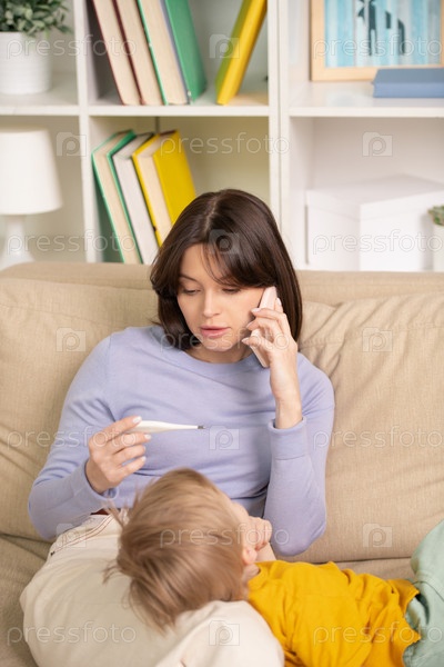 Красивая молодая женщина измеряет температуру своего милого маленького сына, лежащего рядом