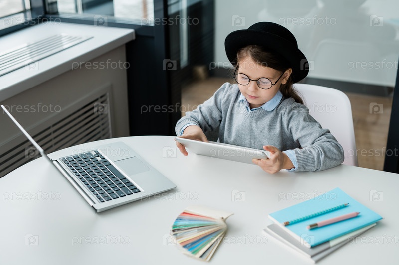 Очаровательная школьница в очках смотрит на дисплей цифрового планшета у стола
