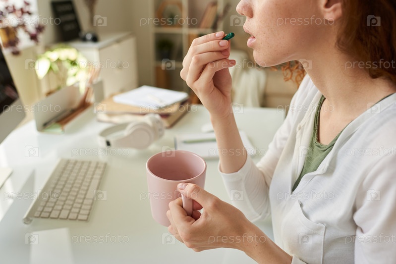 Близкий план девушки, держащей розовую кружку и принимающей биохакерские добавки для увеличения активности мозга