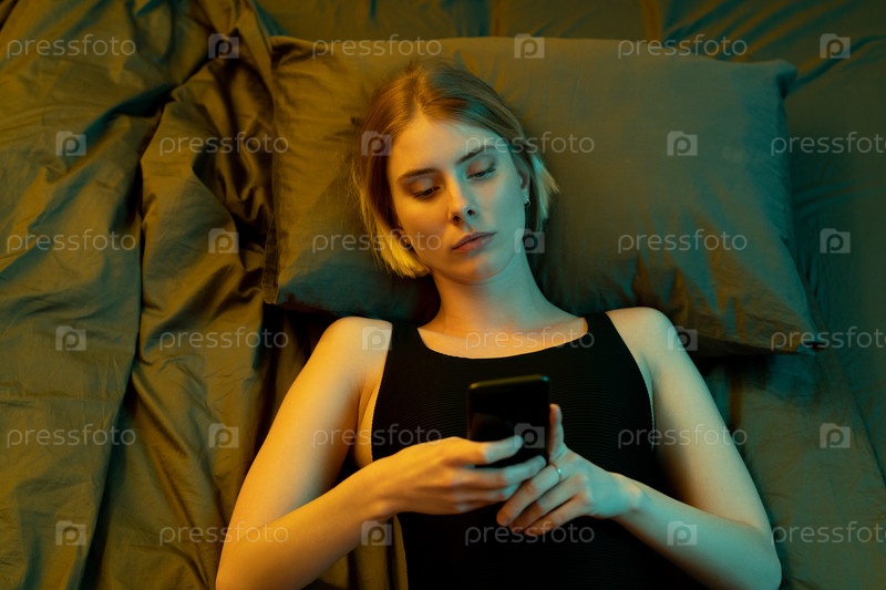 Молодая блондинка-серьезная женщина в черном трусе, прокручивающая онлайн новости