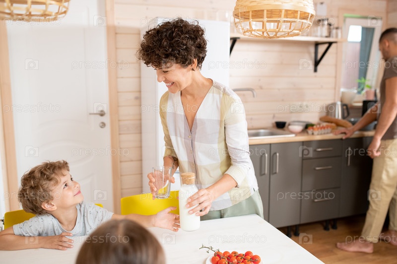 Счастливая мать смотрит на одного из двух детей и кладет бутылку молока на стол